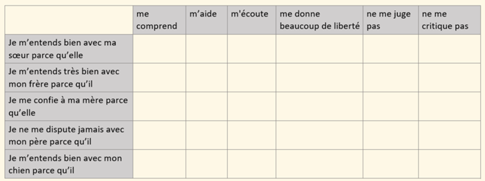 2. Build sentences: Students have to build a sentence using chunks of L2 or L1 language provided, so they have to think of a sentence to create that incorporates those phrases eg. the left column could contain different time phrases, and the top row could be key verb phrases in the je form or other key phrases for the current topic, and students build the rest of the sentence. Esmeralda Salgado does a great blog here walking through a good example of how you could do this, this one also involves some manipulation as the verbs have to be conjugated on the spot