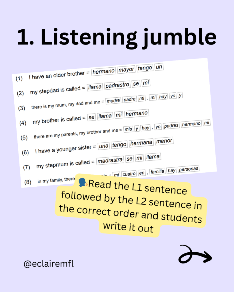 - Read out the English sentence, followed by the TL sentence in the correct order – students must listen carefully and write out what they hear, using the jumbled words to help with spelling.