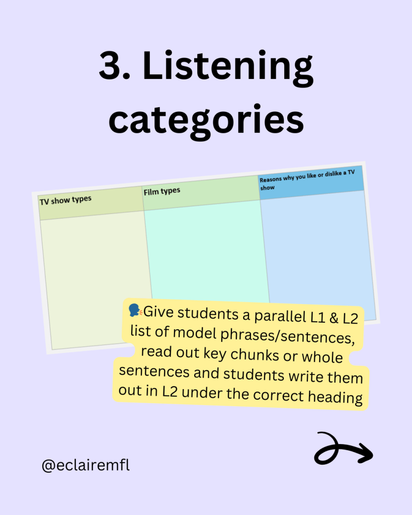- Students must listen, identify the phrase from the list and write it in the TL under the correct category heading.